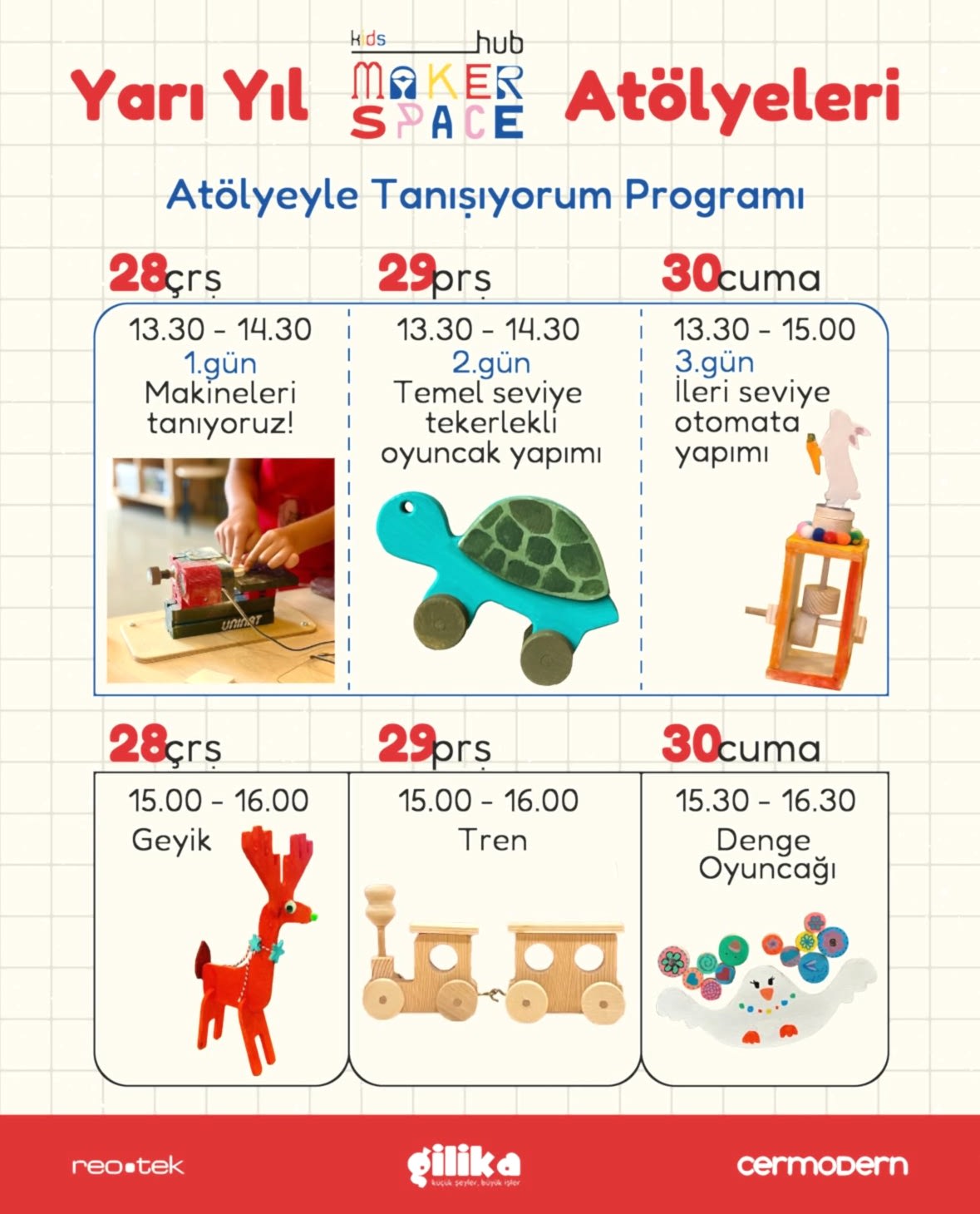 Her hafta farklı bir oyuncak tasarımı ve yepyeni bir deneyim için sizleri Cermodern’e bekliyoruz! Üreterek öğrenmenin keyfini çıkarmaya hazır olun!