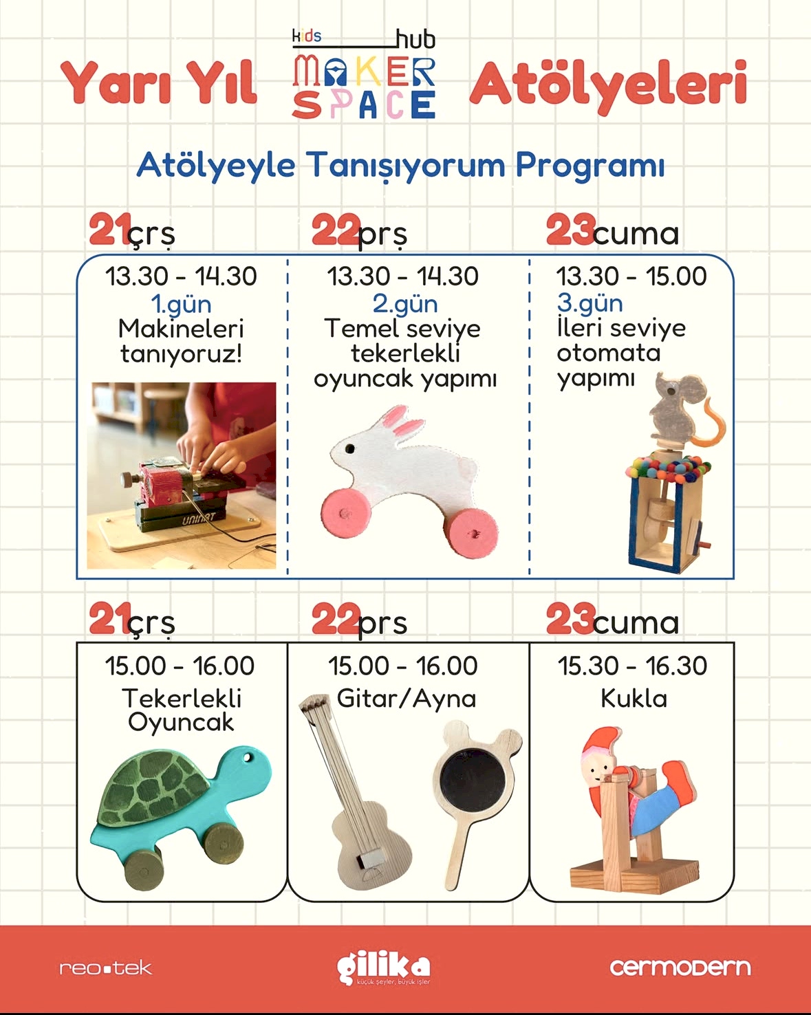 Cermodern Makerspace’te çocuklar için yaratıcı ve eğitici atölyeler düzenliyoruz. Bu atölyelerde çocuklar hem eğlenecek hem de kendi elleriyle ürettikleri oyuncaklarla unutulmaz bir deneyim yaşayacaklar!
